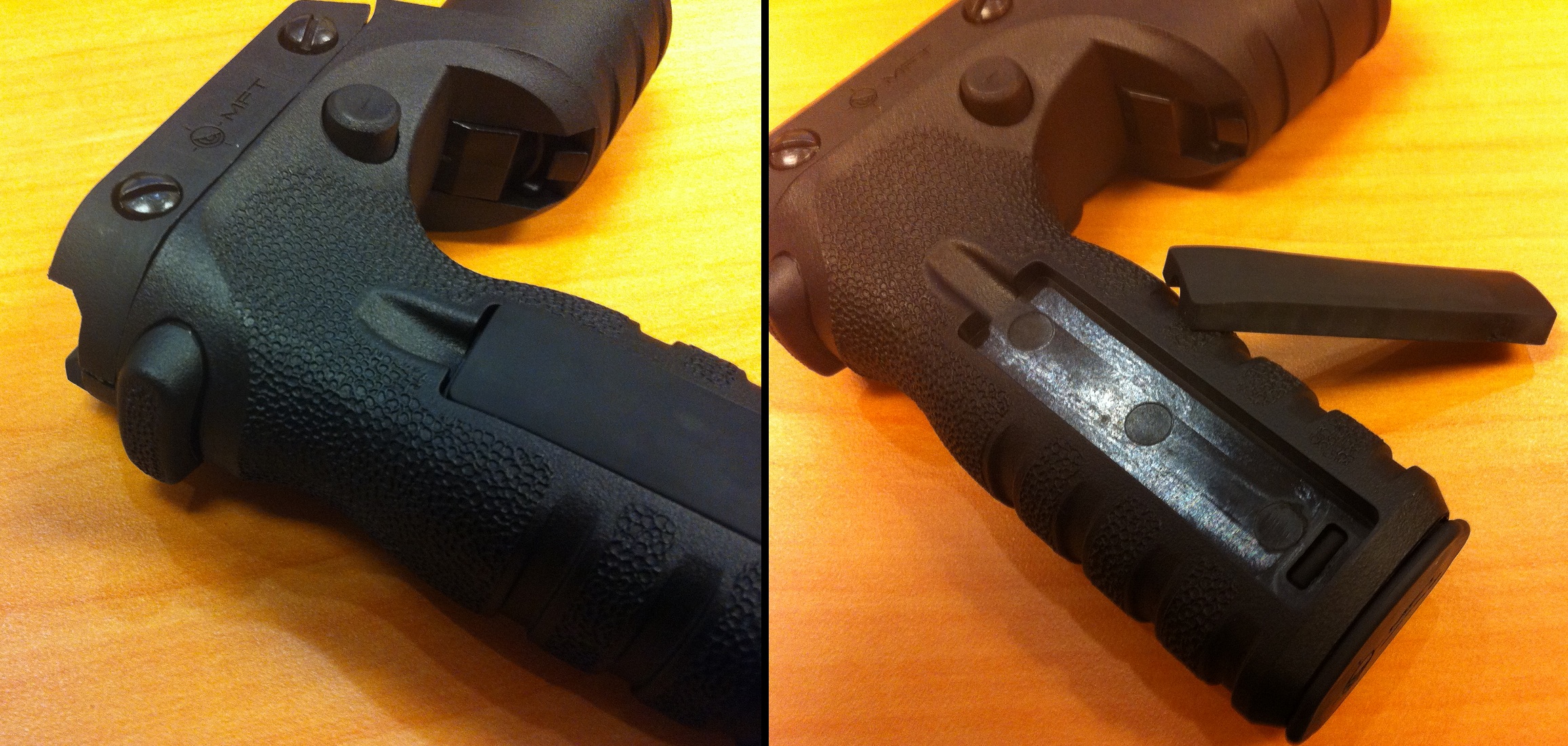 Another cool feature is the watertight storage compartment with customizable foam inserts to prevent rattling.  You could put batteries, gun maintenance tools and more in there without adding any bulk.  Like the E-VolV Battle Stock, the React Grip is lightweight and feels really strong.  It’ll hold up to a tremendous amount of punishment without issue.