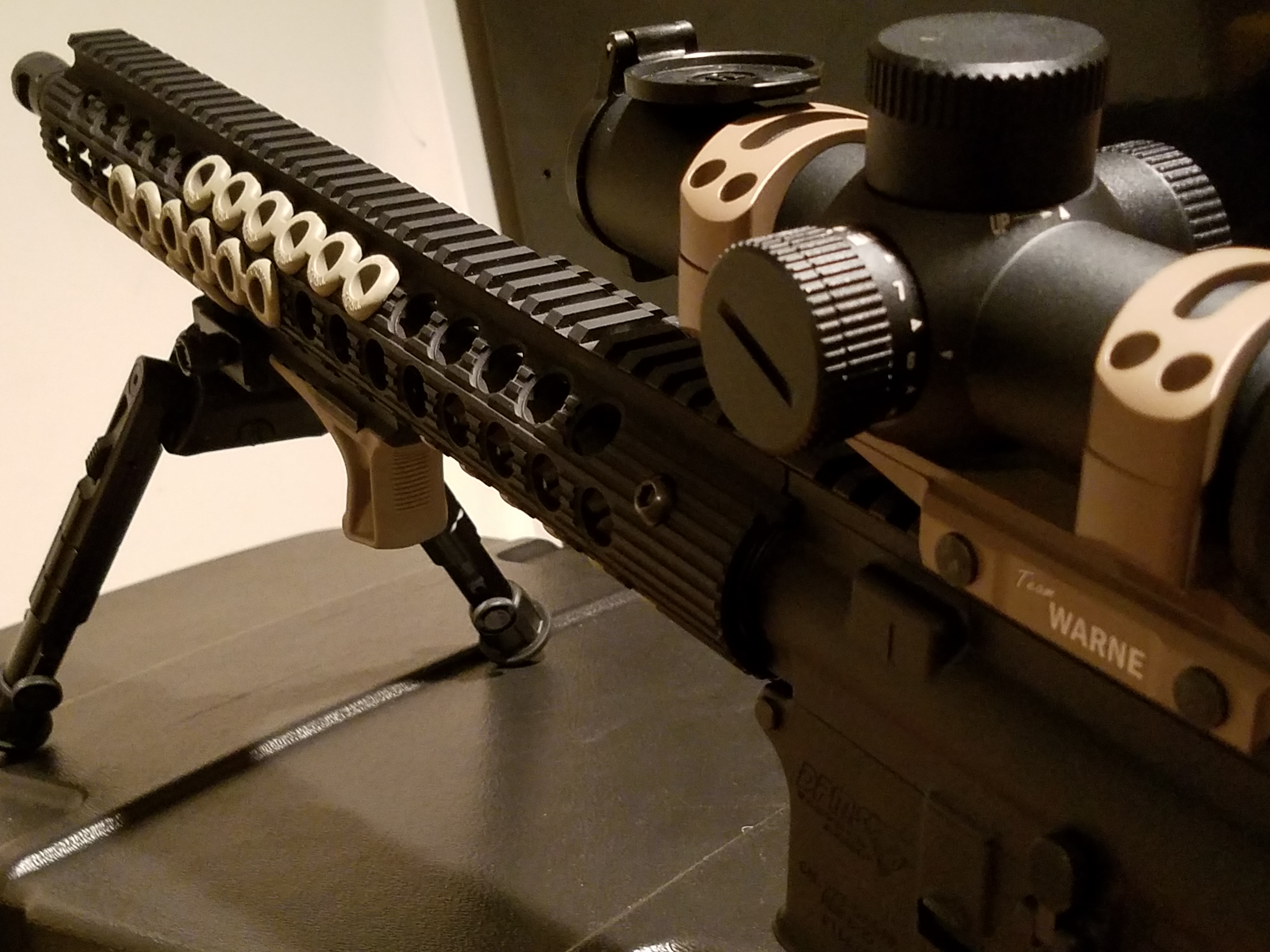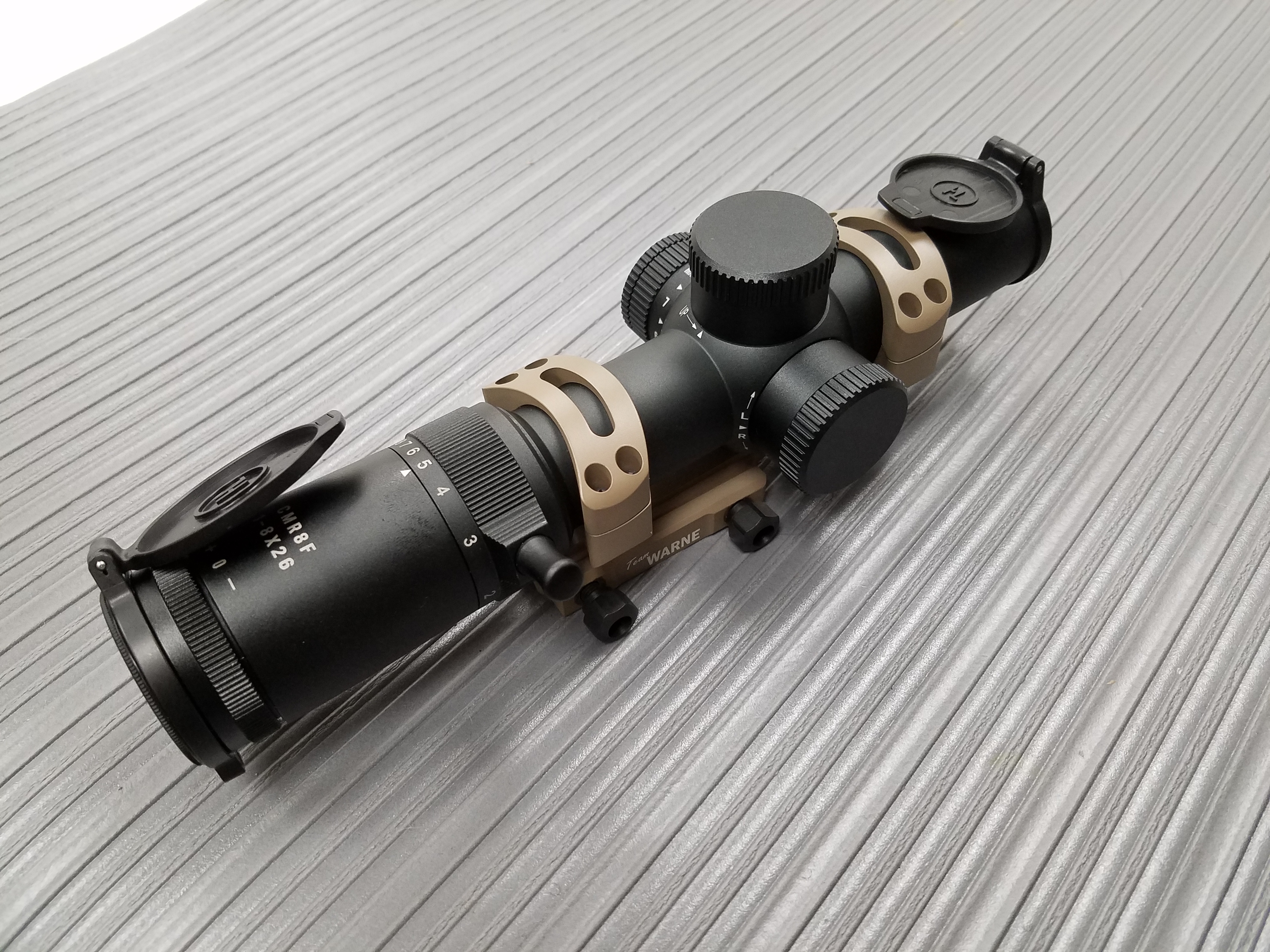 Built on a 34mm tube diameter, the AVS-CMR8 is the lightest 1-8x scope on the market and the only one with a green illumination option at that price point. The scope has a built in throw lever which is great for making rapid magnification changes or fine adjustments as well as Zero-LOK turrets so once you have it sighted in, it stays that way. The flip caps are nicely made as well and use magnets to stay closed. Really the AVS-CMR8 just needs a mount to be ready to go out of the box. I used the Warne 34mm Skeletonized mount and the FDE finish complimented my rifle beautifully. While the reticle is intended for .308 applications, I was still able to effectively use it on a 5.56 rifle.